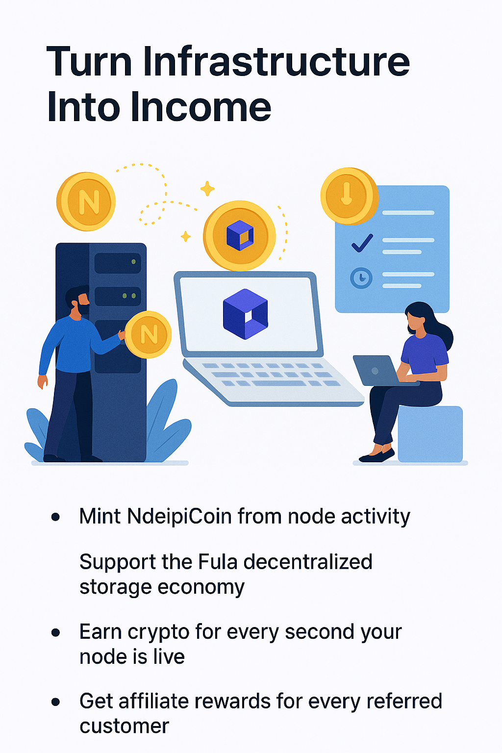Your node mints NdeipiCoin and Fula automatically based on usage, not speculation.
